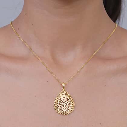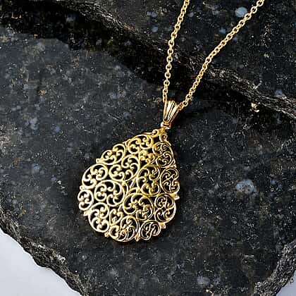 Elevate your everyday style with this intricately designed pendant and chain, crafted to reflect timeless elegance and delicate artistry. The teardrop silhouette is adorned with fine filigree detailing, creating an openwork pattern that captures light with a soft, graceful shimmer. Its design feels both classic and expressive, offering a refined look that stands out without overwhelming. Finished in a radiant yellow gold tone, the pendant brings warmth and luminosity, enhancing its detailed craftsmanship while remaining effortlessly wearable. Light and comfortable, it rests beautifully along the neckline, adding a subtle yet sophisticated touch to any outfit. It is a reflection of elegance, detail, and effortless charm.