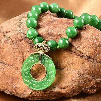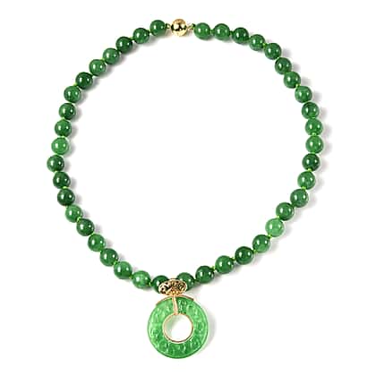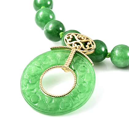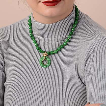 606.52 Ct. Hand Carved Green Jade Beads Necklace in Yellow Gold Overlay Sterling Silver 18 Inches