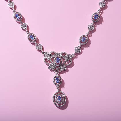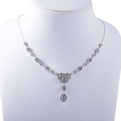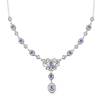 A beautiful necklace that seems straight out of the Victorian era, this Ceylon Sapphire necklace takes a beautiful shape from 10.8 grams of sterling silver. A rhodium overlay adds brilliant lustre to the ornate floral and paisley motifs studded with 4x3mm sapphires and 2mm round natural Cambodian zircons to adorn the design. The statement necklace is perfect for formal occasions.