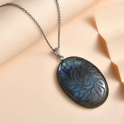 Close Out- Labradorite Carved Solitaire Pendant with Steel Chain (Size 20) in Rhodium Overlay Sterling Silver 77.42 Ct.