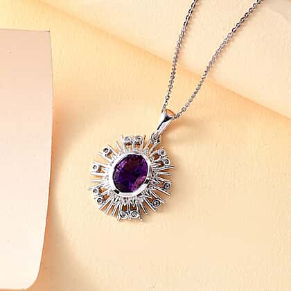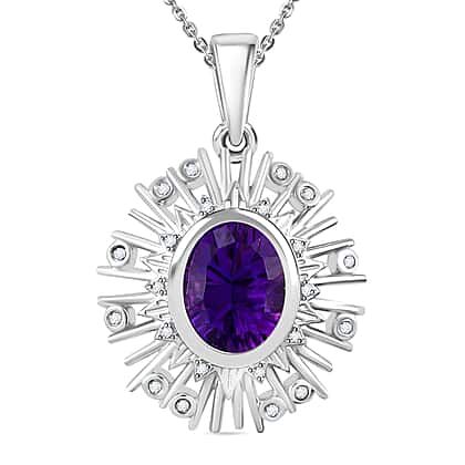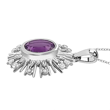 Shine with celestial elegance in this starburst-inspired pendant, with a regal 10x8 mm African amethyst oval centrepiece. The concave cut amplifies the gemstone’s brilliance, while the bezel-set design ensures a secure hold. Encased in rhodium-overlay sterling silver, the piece radiates sophistication and enduring beauty. Paired with a 20-inch chain, this pendant is a cosmic masterpiece that enhances any neckline with a touch of grandeur.