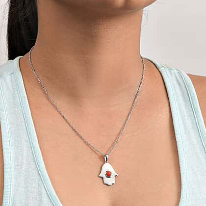 This Coral Hamsa Hand Pendant recreates a divine symbol of protection as a chic piece of jewellery. The smooth surface of the solid Hamsa Hand lends this ancient symbol an uber modern finish. The 5mm coral set at the centre stands out with its fiery red hue against the reflective shine of Rhodium Overlay Sterling Silver. A Size 20 stainless steel chain is included with the pendant.