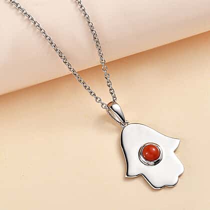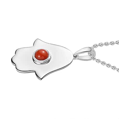 Coral Hamsa Hand Pendant with Stainless Steel Chain (Size 20) in Rhodium Overlay Sterling Silver