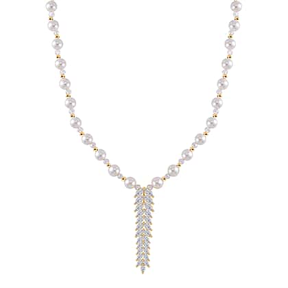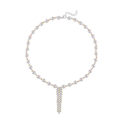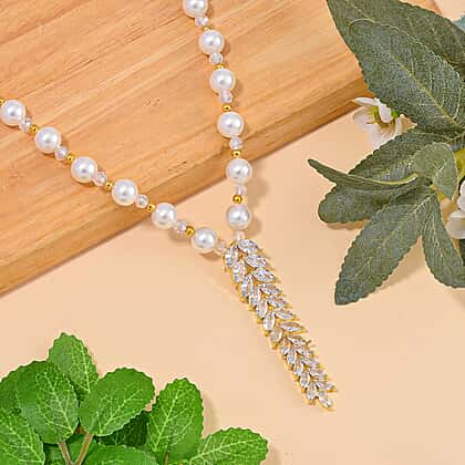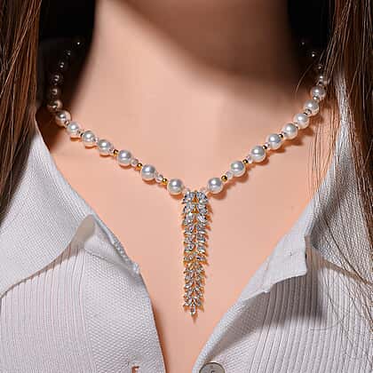 Designer Closeout - White Colour Shell Pearl, White Cubic Zirconia and Crystal Necklace (Size 20-22)