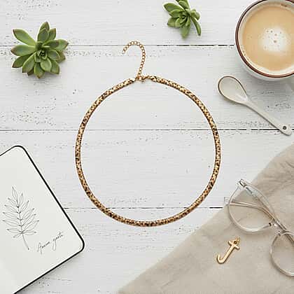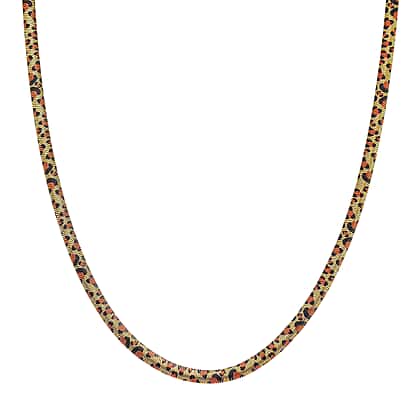 Go wild by embracing bold leopard patterned jewellery. This necklace beautifully embodies the untamped spirit of the feline creature. It features orange and black abstract patterns on the golden body of the necklace. Crafted in stainless steel, it exudes a ladylike allure and is perfect for individuals who have a 'more is more' approach when it comes to jewellery. This 20-inch matinee length necklace just rests below the collarbone. Style this necklace with chunky earrings to strike a bold, powerful look.