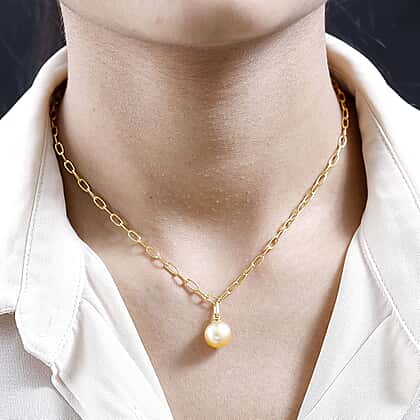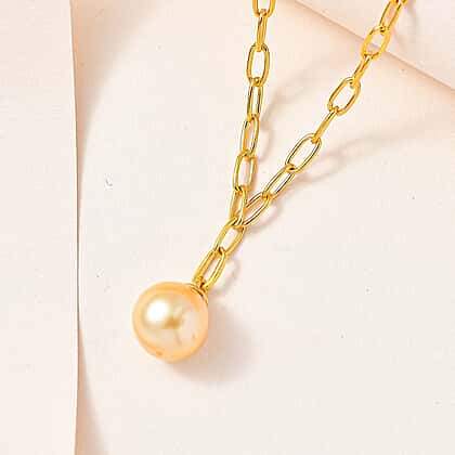 Designer Inspired- Golden South Sea Pearl (10MM) Paperclip Necklace (Size 18) in 18K Yellow Gold Vermeil Plated Sterling Silver