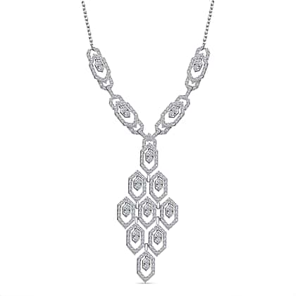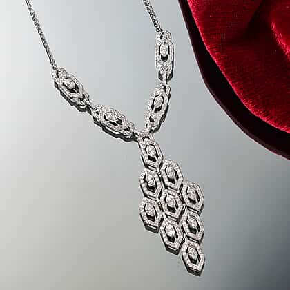 Crafted to captivate, this lab-grown diamond cluster necklace in rhodium overlay sterling silver brings art deco glamour to modern life. Designed in a bold geometric motif with interlocking hexagonal shapes, it evokes strength, confidence, and timeless charm. Each lab-created diamond is ethically grown, offering radiant sparkle, fire, and clarity comparable to natural stones but with a lighter footprint. The tarnish-resistant, hypoallergenic 925 sterling silver ensures lasting brilliance, perfect for those with sensitive skin. At 20 inches, it sits gracefully at the collarbone, secured with a reliable lobster clasp. A dazzling statement piece that celebrates individuality, power, and elevated self-expression.