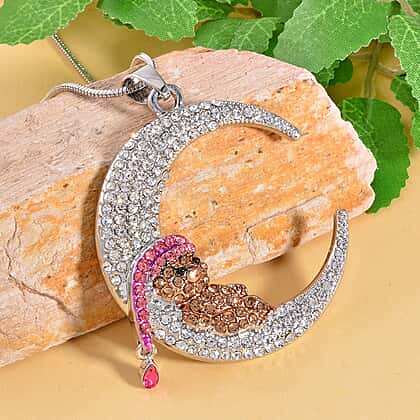 Designer Inspired Multi colour Austrian Crystal Teddy Bear on Crescent Moon (Necklace -28-3 Inch Ext) in Silver Tone