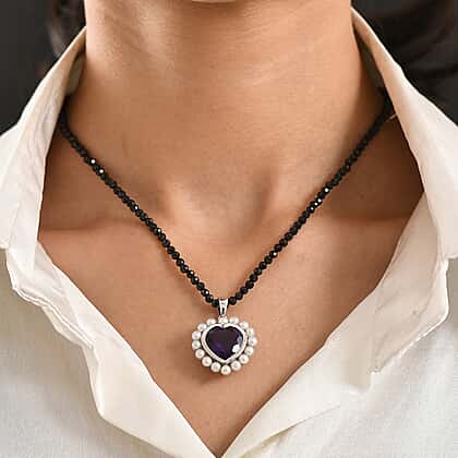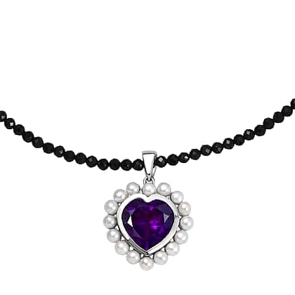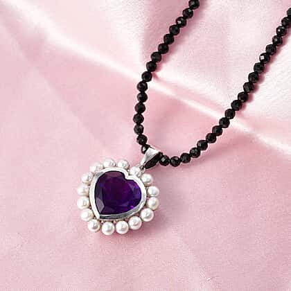 D'Joy - African Amethyst, Black Spinel & Fresh Water Pearl Heart Pendant with Beads Chain (Size 20) in Rhodium Overlay Sterling Silver 52.50 Ct.
