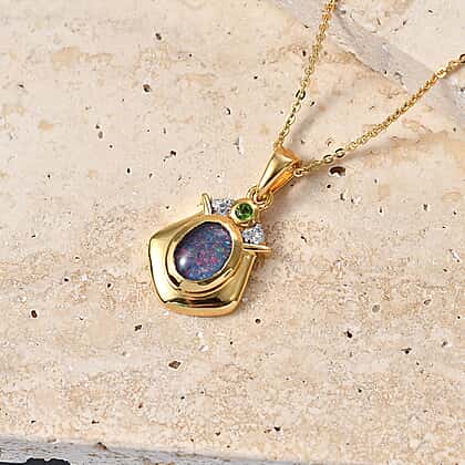 D'Joy - Boulder Opal Triplet, Natural Chrome Diopside & White Zircon Pendant with Chain (Size 20) in Yellow Gold Plated Sterling Silver