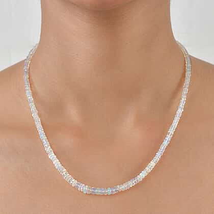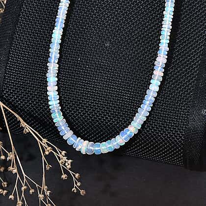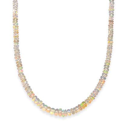 Bring a soft play of colour to your look with this Ethiopian opal bead necklace, designed to reflect light with subtle iridescence. The finely cut beads display shifting tones that move between soft pastels and luminous flashes, creating a delicate yet eye-catching effect. Each opal is carefully arranged to form a smooth, continuous strand that sits comfortably along the neckline. The natural variation in colour adds depth and uniqueness, making every piece feel distinctive. The rhodium overlay on 925 sterling silver offers mirror like shine and polsihed finish. Completed with a secure clasp and extender, it offers an adjustable fit for added ease and versatility. It is a reflection of light, colour, and effortless style. Add it to your collection and let its natural colour play enhance your everyday style.