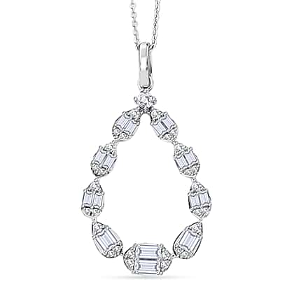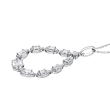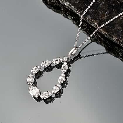 Refine your look with this moissanite pendant and chain, designed in a graceful teardrop-inspired form. A sequence of carefully set shimmering stones creates a continuous flow of light, offering brilliance that catches attention from every angle. Each stone is placed with precision to maintain clarity and balance, resulting in a design that feels both modern and timeless. Finished in rhodium overlay on 925 sterling silver, the pendant delivers a bright, polished shine while enhancing durability for everyday wear. Light and comfortable, it rests neatly along the neckline, adding a subtle yet eye-catching accent to your style. It is a reflection of detail, refinement, and effortless charm.