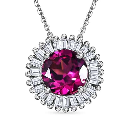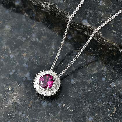 D'Joy - Natural Radiant Ember Garnet & White Diamond Halo Pendant with Chain (Size 20) in Rhodium Overlay Sterling Silver 0.93 Ct.
