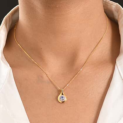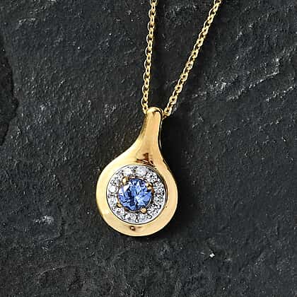 D'Joy - Tanzanite & White Zircon Halo Pendant with Chain (Size 20) in Yellow Gold Plated Sterling Silver