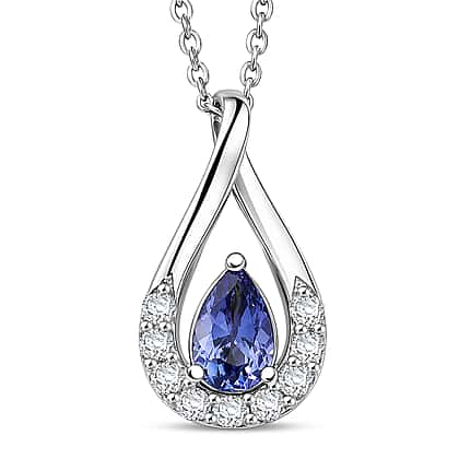 D'Joy - Tanzanite & White Zircon Pear Cut Solitaire Pendant with Chain (Size 20) in Platinum Overlay Sterling Silver