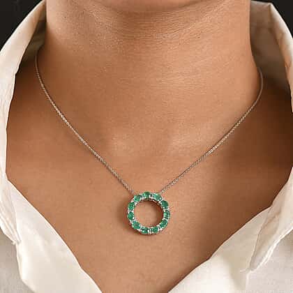 D'Joy AAA Gemfields Zambian Emerald & White Zircon Circle Pendant with Chain (Size 20) in Rhodium Overlay Sterling Silver 1.97 Ct.