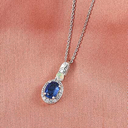 D'Joy AAA Natural Kashmir Kyanite, White Zircon & Ethiopian Opal Halo Pendant with Chain (Size 20) in Platinum Overlay Sterling Silver 1.26 Ct.