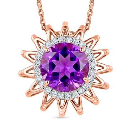 D'Joy AAA Rose De France Amethyst & White Zircon Sunburst Pendant with Chain (Size 20) in Rose Gold Plated Sterling Silver 2.88 Ct.