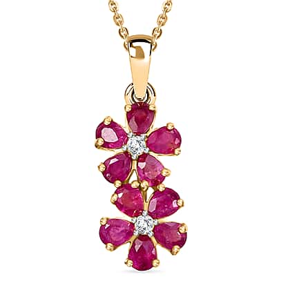 D'Joy African Ruby, White Zircon Floral Pendant with Chain (Size 20) in Yellow Gold Plated Sterling Silver 2.32 Ct.