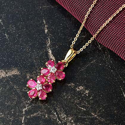 Delightfully feminine, the African ruby floral pendant with chain brings the romance of a blooming garden to fine jewellery. Designed with petals of pear-cut rich red rubies, each gemstone is prized for its vibrant hue, rarity, and natural durability, making it both beautiful and robust. White zircons sparkle at the centre of each flower, echoing the brilliance of diamonds with radiant fire. Set in yellow gold plated sterling silver, this pendant is hypoallergenic, tarnish-resistant, and gentle on sensitive skin. The 20-inch chain completes a timeless piece that’s perfect for adding joy, colour, and elegance to your everyday or evening looks.