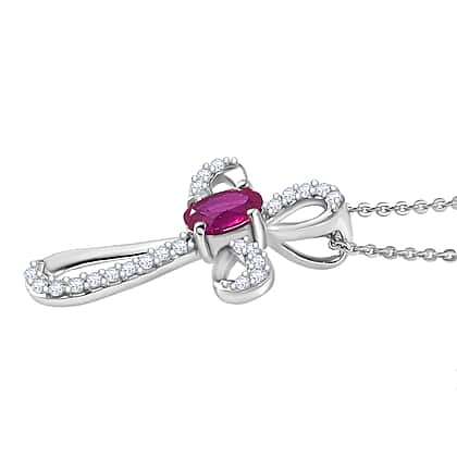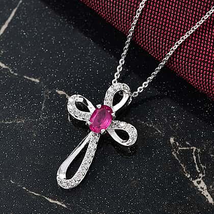 D'joy African Ruby, White Zircon Cross Pendant with Chain (Size 20) in Platinum Overlay Sterling Silver