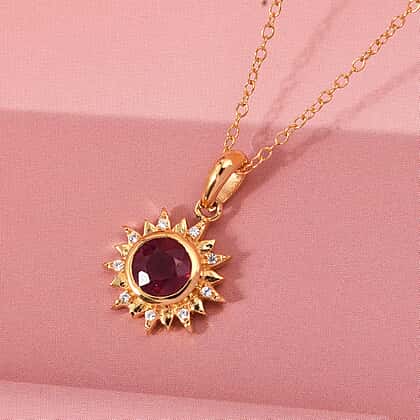 Add a little dose of sunshine energy to your look with D'Joy African ruby and white zircon pendant. Crafted in yellow gold plated sterling silver, this pendant features a round red ruby, surrounded by a starburst halo of white zircons and sculpted details that feels like rays emanating from the sun. This pendant reflects the powerful energy of love. The ruby charm comes attached to a dainty chain, which helps add a refined look to the design.