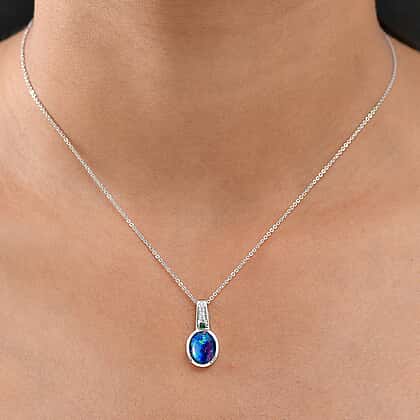 D'Joy Boulder Opal Triplet, Emerald and White Zircon Pendant with Chain (Size 20) in Rhodium Overlay Sterling Silver 1.56 Ct.