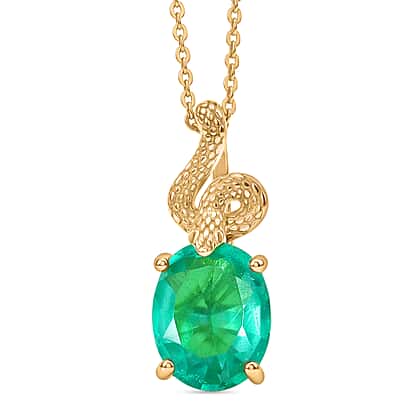 An expression of symbolism and crafted detail, this pendant is defined by its serpent-inspired design, where a finely sculpted snake curves with intricate texture above a vivid emeraldine centre. The oval stone reveals rich green depth with a luminous, glass-like surface, catching light with quiet intensity. The detailed motif introduces movement and character, creating a striking contrast against the smooth brilliance of the gemstone. Set in a yellow gold plating on 925 sterling silver, the warmth enhances both the sculptural detail and the vibrancy of the stone. Suspended from a chain, this piece offers a distinctive balance of meaning, colour, and refined craftsmanship.