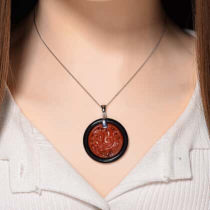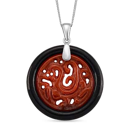 D'Joy Enhanced Red Jade & Dyed Black Jade Dragon Pendant with Chain (Size 18) in Rhodium Overlay Sterling Silver 36.47 Ct.