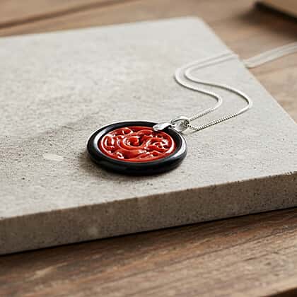 This D'Joy enhanced red jade and dyed black jade dragon pendant is a statement of artful contrast and mythic power. Suspended from a sleek rhodium overlay sterling silver chain, the pendant features a vividly carved red jade dragon encircled by a deep black jade frame, instantly drawing the eye with its sculptural fluidity and fiery intensity. Channeling the energy of ancient Eastern symbolism, red stands for courage and abundance, while black can signify mystery and protection. Striking a perfect balance of heritage and high-fashion, it’s designed for the woman who dares to stand out and write their own story.