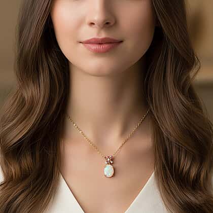 D'Joy Ethiopian Opal, Pink Sapphire & White Zircon Pendant with Chain (Size 20) in 18K Yellow Gold Plating Sterling Silver 1.23 Ct.