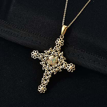 D'Joy Faceted Ethiopian Opal Cross Pendant with Chain (Size 20) in Yellow Gold Plated Sterling Silver.