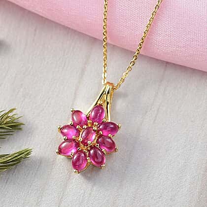 This floral pendant is pure excitement! The D'Joy fissure filled ruby pendant is adorned with oval ruby stones forming a floral pattern. Crafted in yellow gold plated sterling silver, these reddish-pink gemstones are held by minimalistic golden prongs. It adds height and makes stones catch light better. The pretty, floral pendant comes attached to a dainty chain. This pendant feels like a miniature art that speaks to you and can inspire you to celebrate everyday of your life.