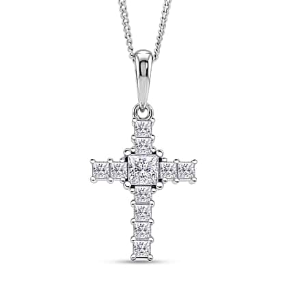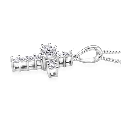 D'Joy GRA Certified Moissanite D-VVS1 Cross Pendant with Chain (Size 18) in Rhodium Overlay Sterling Silver