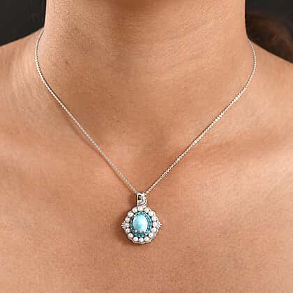 Unleash your inner ethereal fantasy with D'Joy cluster pendant. It features a serene larimar cabochon stone, encircled by neon apatite and freshwater pearls. The design evokes regal heirloom glamour while channeling the tranquility of oceanic blues. Crafted in rhodium overlay sterling silver, this charm comes attached to a dainty chain. This cluster pendant is perfect for the individuals who love mixing timeless sophistication with modern layers. Style it solo for a refined statement or pair with delicate chains for a curated, opulent look.