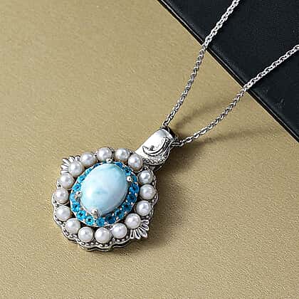 D'Joy Larimar, Fresh Water Pearl & Neon Apatite Pendant with Chain (Size 20) in Rhodium Overlay Sterling Silver 4.20 Ct.
