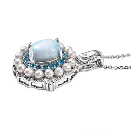 D'Joy Larimar, Fresh Water Pearl and Neon Apatite Halo Pendant with Chain (Size 20) in Rhodium Overlay Sterling Silver 4.20 Ct.