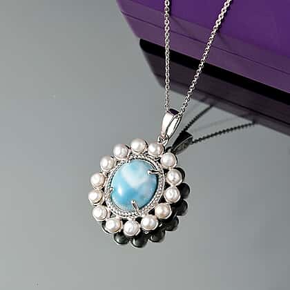 D'joy Larimar & Pearl Whispers of the Deep Pendant with Chain (Size 20) in Rhodium Overlay Sterling Silver 10.68 Ct.