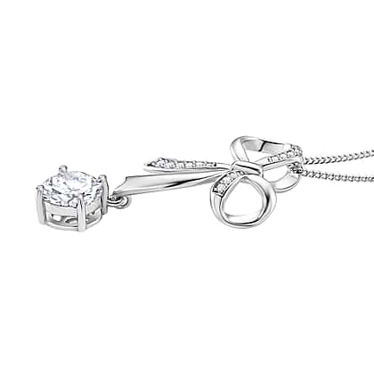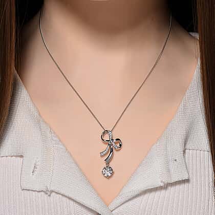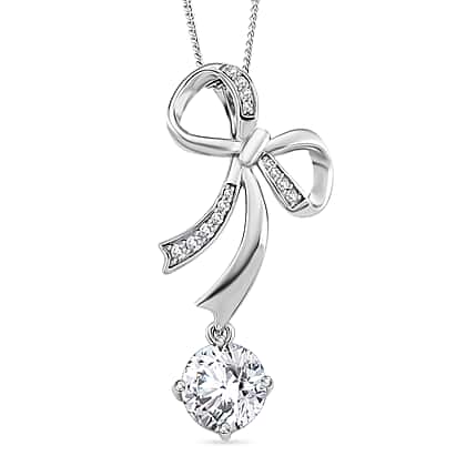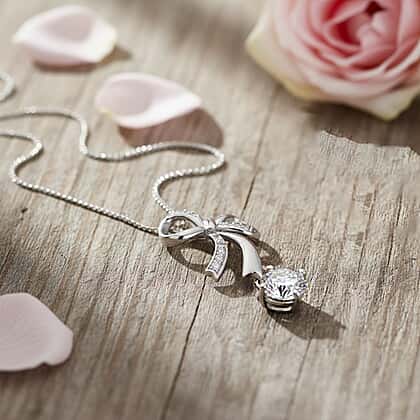 Presenting a ribbon-inspired pendant that brings softness, sparkle and a touch of romance to any look. The flowing bow shape creates a graceful design, leading the eye to a bright moissanite drop that lights up beautifully with movement. Crafted in rhodium overlay on 925 sterling silver, the piece offers a smooth shine and a refined feel on the neckline. Comfortable yet hypoallergenic, the piece ensures safety and comfort for sensitive skin. A lovely choice for gifting, dressing up simple outfits or adding a little sparkle to special moments.