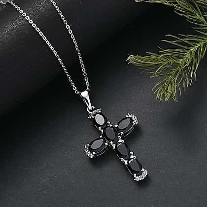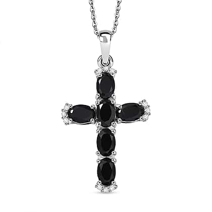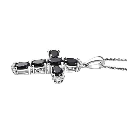 D'Joy Natural Thai Black Spinel & White Zircon Cross Pendant with Chain (Size 20) in Platinum Overlay Sterling Silver 3.44 Ct.