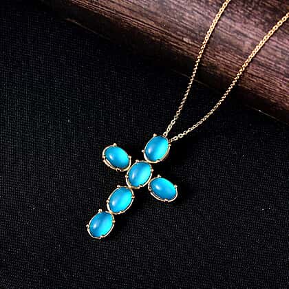 D'Joy Paraiba Moonstone Cross Pendant with Chain (Size 20) in Yellow Gold Plated Sterling Silver 5.05 Ct.