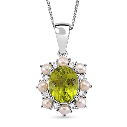 D'Joy Peridot, White Pearl & Moissanite Pendant with Chain (Size 18) in Rhodium Overlay Sterling Silver 3.90 Ct.