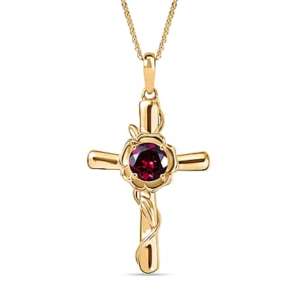 D'joy Rhodolite Garnet Cross Pendant with Chain (Size 20) in Yellow Gold Plated Sterling Silver 1.63 Ct, Silver Wt. 5.50 Gms.