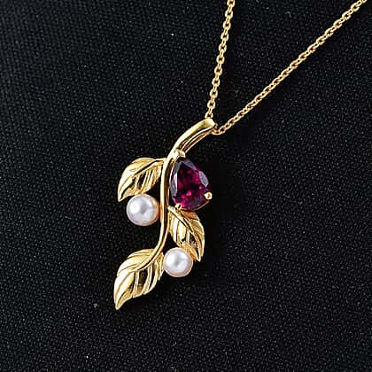 D'Joy Rhodolite Garnet & Fresh Water Pearl Pendant with Chain (Size 20) in Yellow Gold Plated Sterling Silver 1.40 Ct, Silver Wt. 4.19 Gms