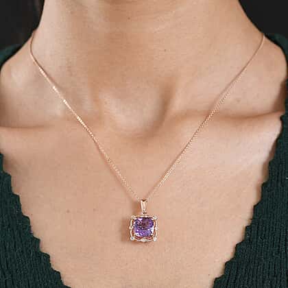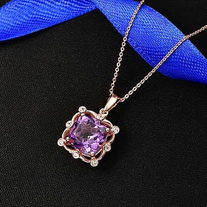 D'Joy Rose De France Amethyst & White Zircon Cushion Cut Halo Pendant with Chain (Size 20) in Rose Gold Plated Sterling Silver 4.54 Ct.