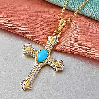 D'Joy Sleeping Beauty Turquoise Cross Pendant with Chain (Size 20) in Yellow Gold Plated & Platinum Overlay Sterling Silver