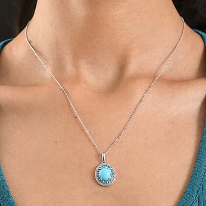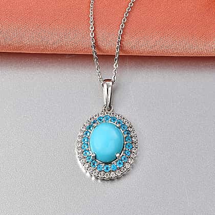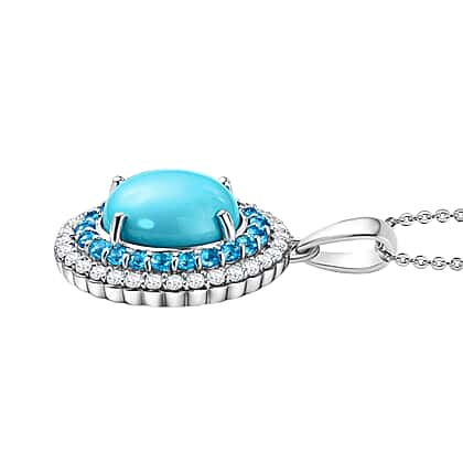 D'Joy Sleeping Beauty Turquoise, White Zircon & Neon Apatite Cabochon Halo Pendant with Chain (Size 20) in Rhodium Overlay Sterling Silver 3.02 Ct.