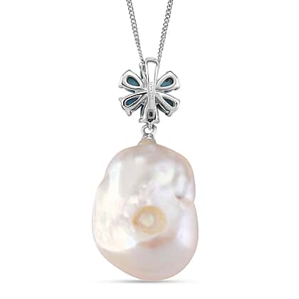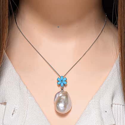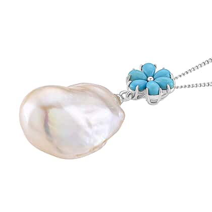 D'joy White Fresh Water Pearl & Sleeping Beauty Turquoise Pendant with Chain (Size 18) in Rhodium Overlay Sterling Silver 43.56 Ct.