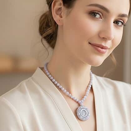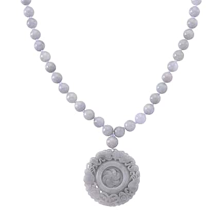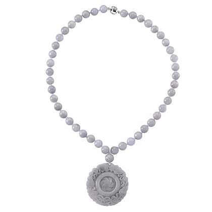 D'Joy White Jade Beads Necklace with Flower Carved Pendant (Size - 20) in Rhodium Overlay Sterling Silver 520.00 Ct.