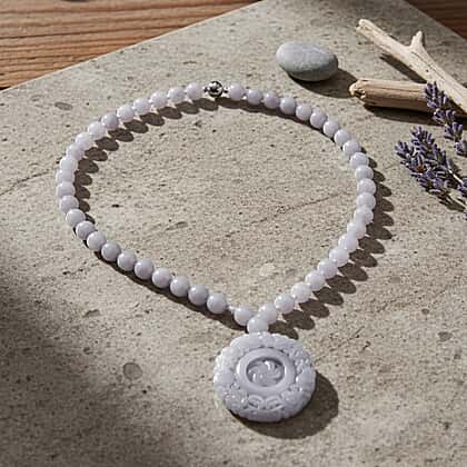 This white jade necklace offers a refined touch to any jewellery collection with its smooth jade beads, each chosen for its natural beauty, and is complemented by a carved pendant with a swirling design. The rhodium overlay on 925 sterling silver adds strength and shine, making the piece both durable and stylish. The piece's glossy, polished finish offers beauty and charm that capture attention. Finished with a secure clasp closure for security and a comfortable fit. The adjustable length ensures a relaxed fit for different neck sizes. White jade is known for its calming properties, making it perfect for both everyday wear and special occasions.
